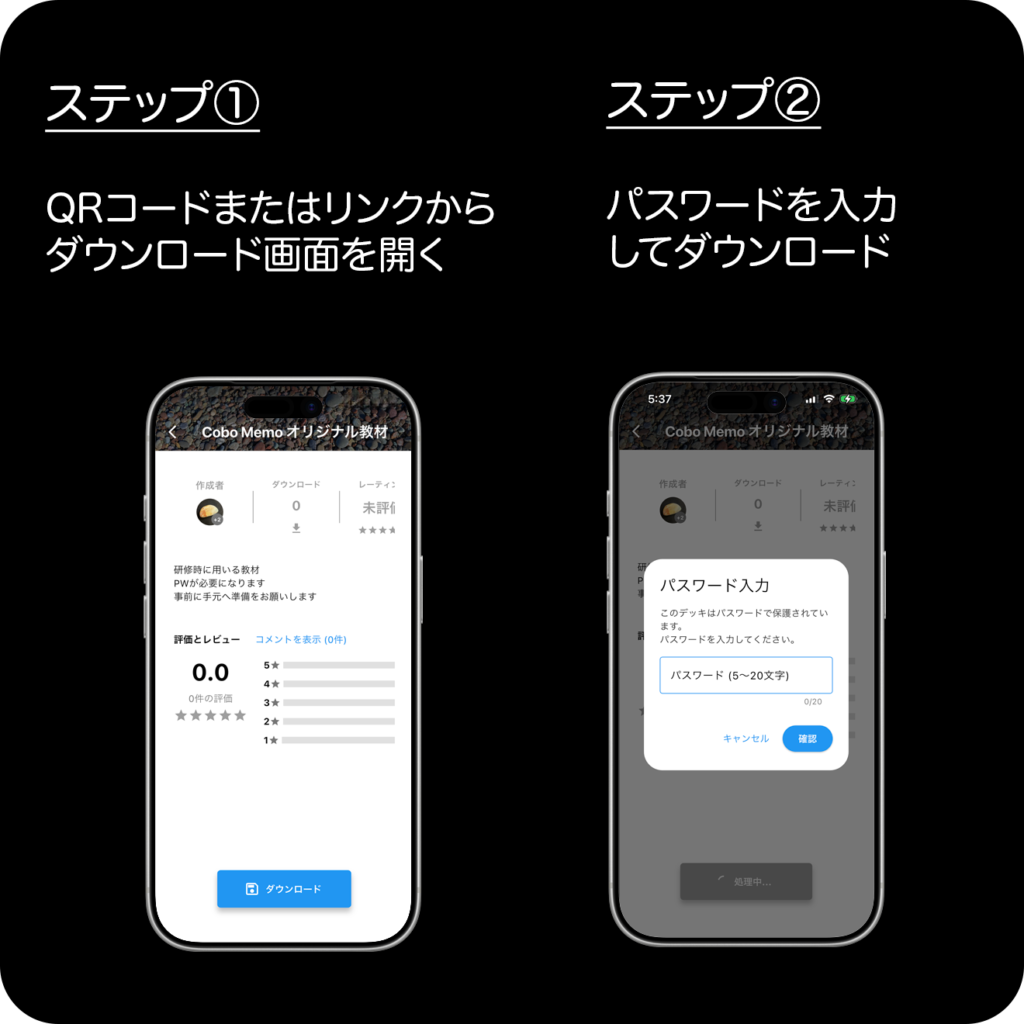 パスワード保護されたデッキを生徒・受講者に限定配布。オリジナル教材をそのままアプリで学習させることができます。