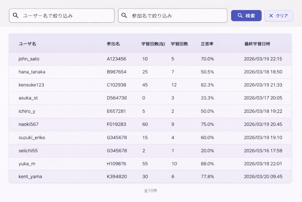 PCのWebコンソールから、受講者一人ひとりの学習進捗を確認。どこで詰まっているかが一目でわかります。