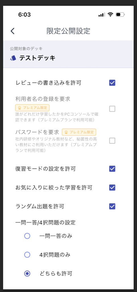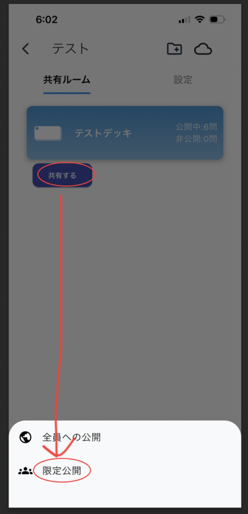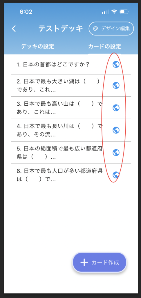 カードを作成したら、デッキを長押しで下の画面を開きます。カードの設定タブで、下のように地球アイコンをタップして、公開するカードを選択します。