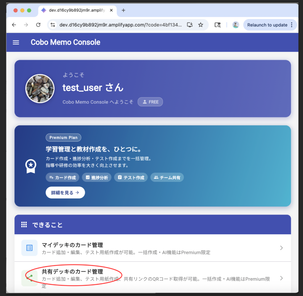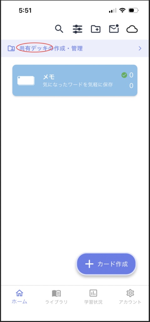 へアクセスし、共有デッキのカード管理をタップし、先ほど作成した共有スペースをタップ