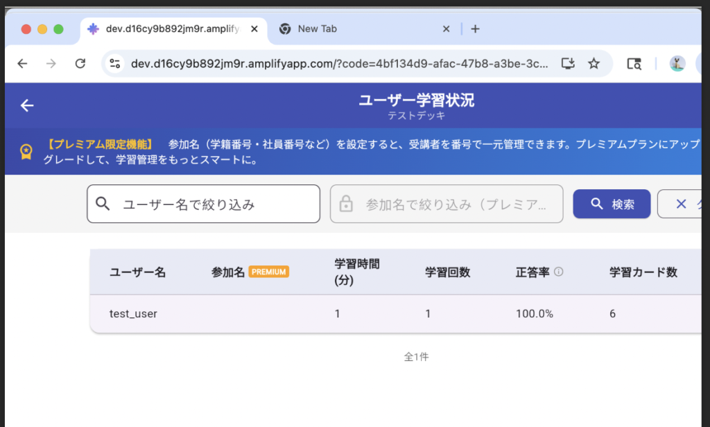 ユーザごと、カード単位での学習状況を確認することができます。ユーザ学習状況確認画面では、デッキごとにユーザの学習状況を確認できます。