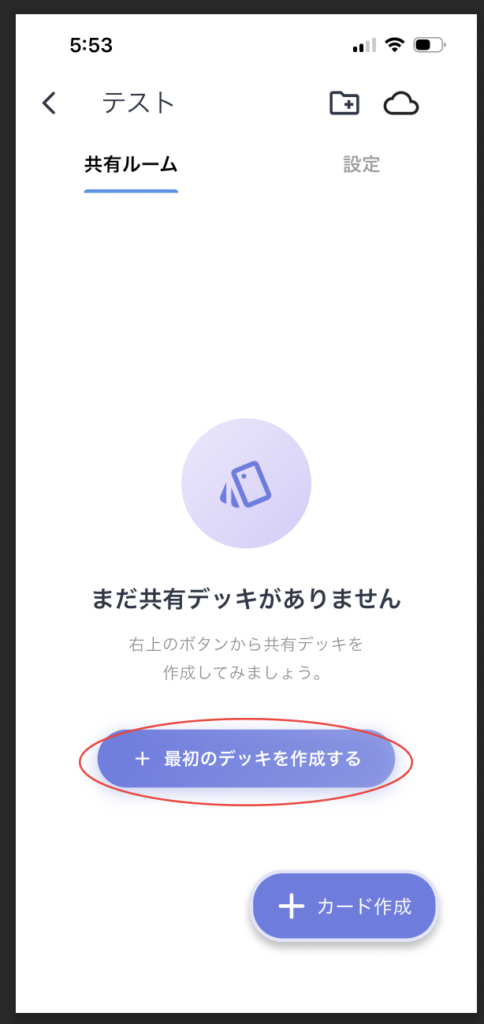 1つ目のデッキを作成してください。ここではテストデッキと入力しました