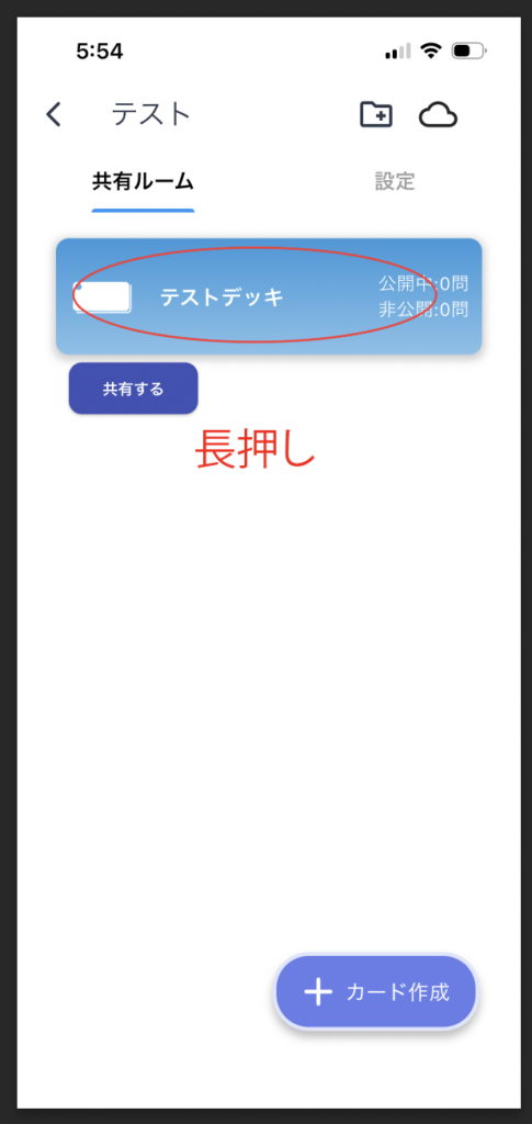 次に、デッキの中にカードを作っていきます。カード作成画面はデッキを長押しするか、画面右下のカード作成ボタンをタップすることで開くことがきます